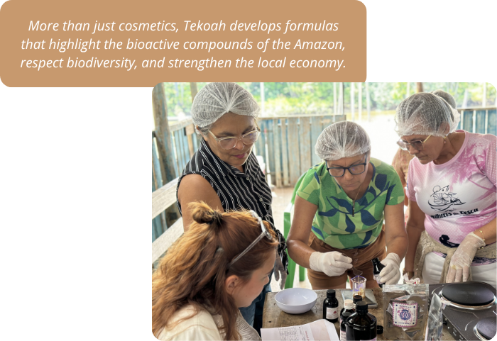 With this purpose, the SouTekoah Project was also born, an initiative that transforms the lives of women from extractive communities in the Amazon by uniting theory and practice in the production of natural makeup and cosmetics. More than just free training, the project promotes autonomy, self-esteem, and female entrepreneurship in the heart of the forest, having already impacted 4 communities in Pará, such as Santo Antônio do Tauá and Cametá, and directly benefited more than 60 women through the provision of technical knowledge, income generation, and strengthening of the sense of belonging, expanding the financial independence of Amazonian women, stimulating sustainable production chains, and valuing local biodiversity.